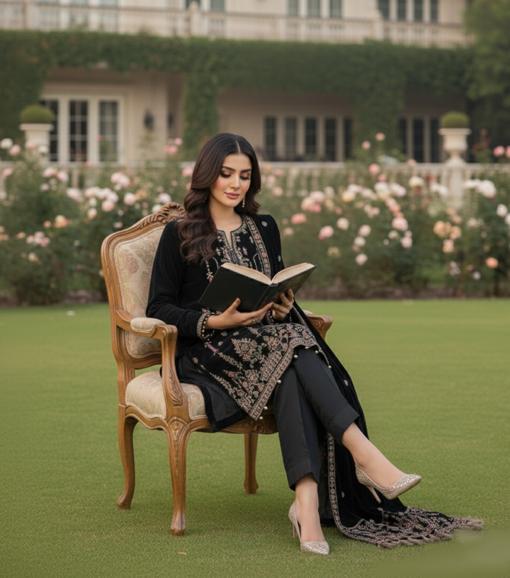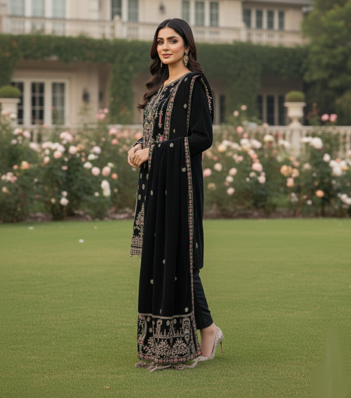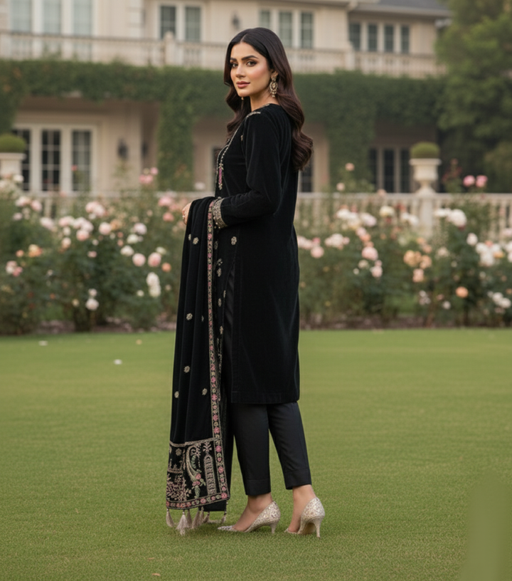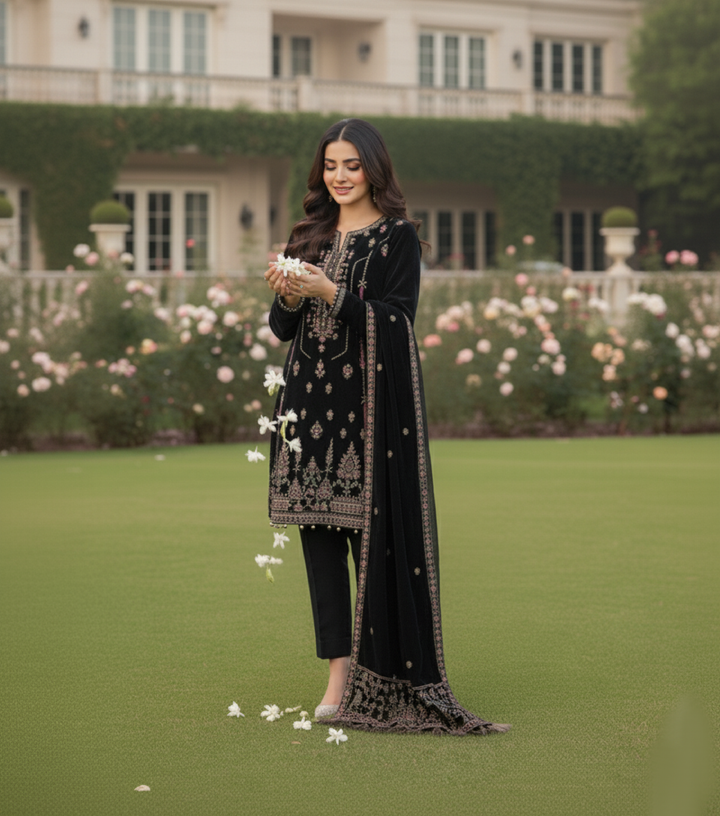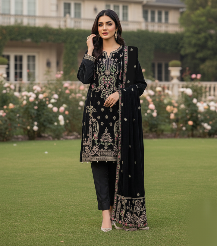Indulge in the luxurious comfort and timeless elegance of our 3-Piece Heavily Embroidered Velvet Suit, designed for the modern woman who appreciates traditional craftsmanship. This stunning ensemble is the epitome of sophistication, perfect for formal events, festive gatherings, or winter celebrations.